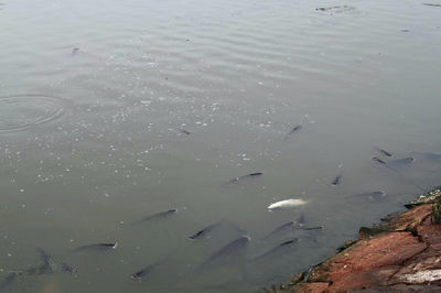 当水质清瘦天然饵料缺乏时,鲢鳙会结群上浮觅食,抢食饲料粉末,吞食下风处有机浮膜,但行动敏捷,游泳自如,并非缺氧引起。